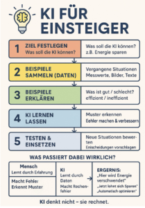 Zunächst wird die Lernaufgabe eindeutig festgelegt, etwa das Erkennen von ineffizientem Energieverbrauch im Haus und in der Wohnung. Im nächsten Schritt werden reale Daten gesammelt, zum Beispiel Verbrauchswerte, Zeitpunkte oder Nutzungsmuster. Diese Daten werden bewertet, damit die KI-Unterschiede zwischen sinnvoller und problematischer Nutzung erkennen kann.