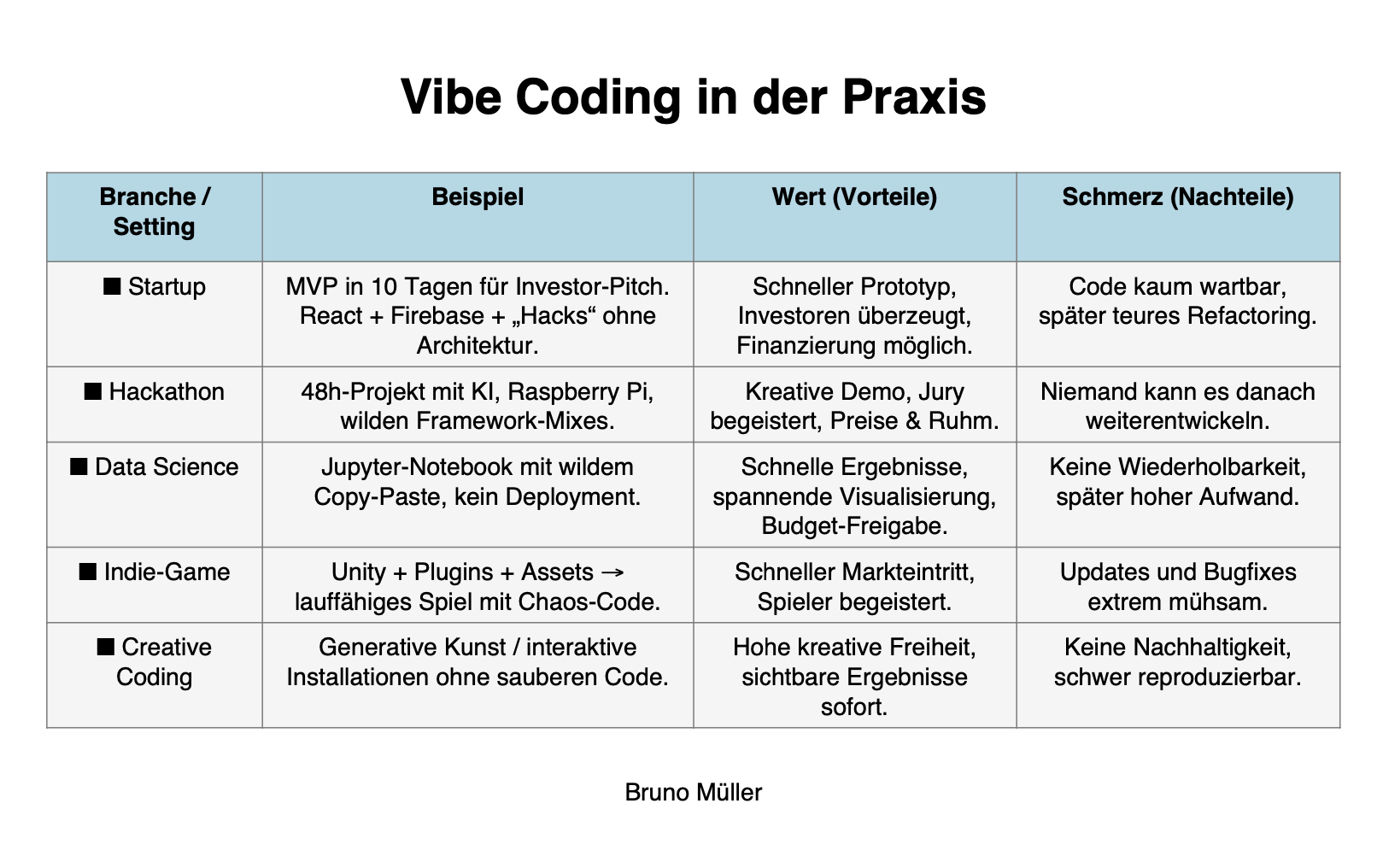 Für stabile, langlebige Systeme sollte Vibe Coding jedoch immer in eine strukturierte Softwareentwicklung überführt werden.